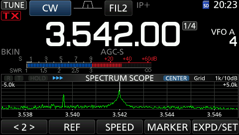 RF maximum Bandbreite : 500 Hz Filterkurve : sharp Sichtbereich : 14008 kHz bis 14026 kHz Antenne: auf Masse geschalten
